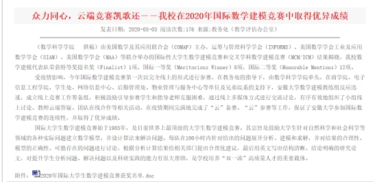 线下有序组织和选拔参加各类国际、国家、省级、校级联赛等专业竞赛。2019年组织全校700多位同学参加集中培训以及安徽大学校内选拔赛,选拔200余位同学参加数学竞赛及数学建模竞赛。通过“线上线下”数学建模竞赛阵地链的打造,发挥平台优势,提升学科服务水平,带动学科建设。
