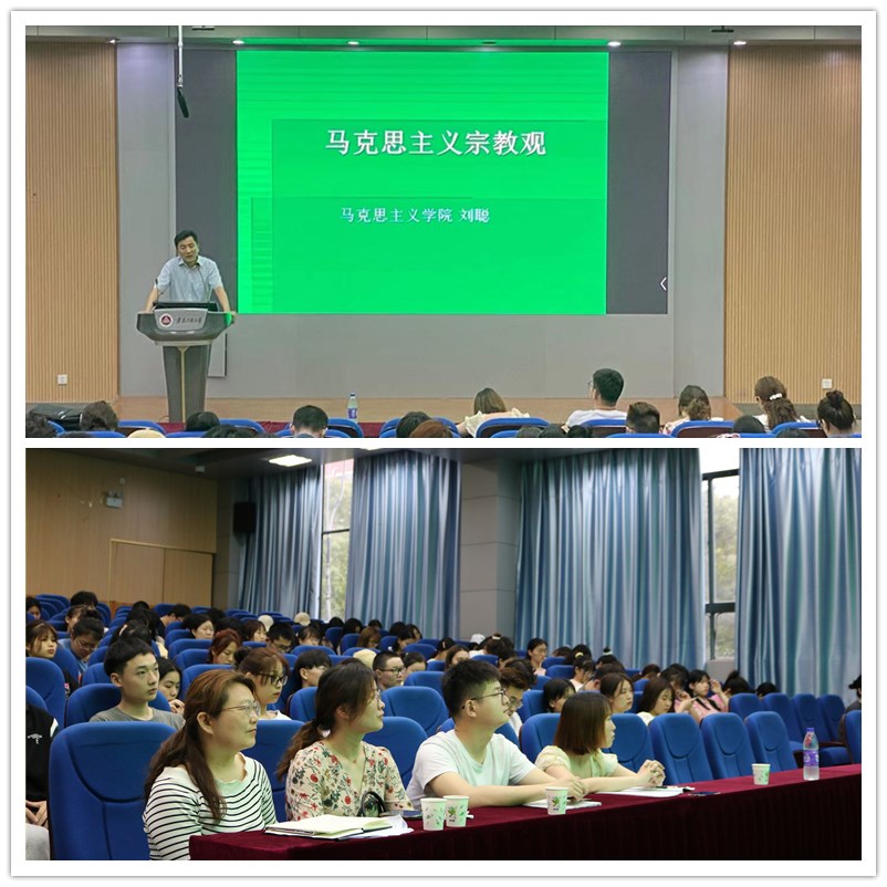 建党百年之际,为筑牢青年大学生理想信念之基,引导广大学生科学认识宗教,预防非法宗教对大学校园的渗透,帮助同学们树立正确的世界观,5月10日晚,人文学院在5教117举办马克思主义宗教观专题讲座。邀请马克思主义学院刘聪教授主讲。院党委副书记金艾裙、院团委书记、全体辅导员、19级全体学生共150余人参与学习。讲座由院党委副书记金艾裙主持。