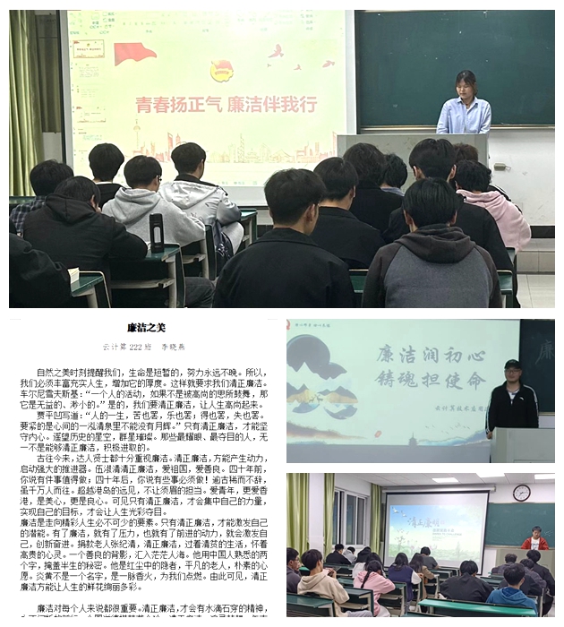 植廉洁之苗,育廉洁之心。学院各班召开展廉洁教育主题班会,将廉洁清风注入学生心田,培养学生廉洁自律道德操守,培育学生自信自强开拓进取的创新精神、价值理念、职业观念,展现时代价值,激励大学生在今后的学习生活中更好地实现自己的人生价值,砥砺奋进前行。弘扬主旋律、讴歌新时代、引领新风尚,增强廉洁文化向心力,形成清正廉洁新风气、新风貌。与时俱进增强本领,全面提升素质能力。教育并引导全院师生知所避、知所趋、知所守,在求学实践上下功夫,在创新发展中花精力,做廉洁清正的好老师,踏实勤勉的好学生。移动互联应用技术212班赵子聪同学表示:作为青年一代,在今后的学习与生活中,会坚定理想信念,优化专业本领,提高意识觉悟,锤炼意志品行,勇担使命责任,践廉于心、于行。