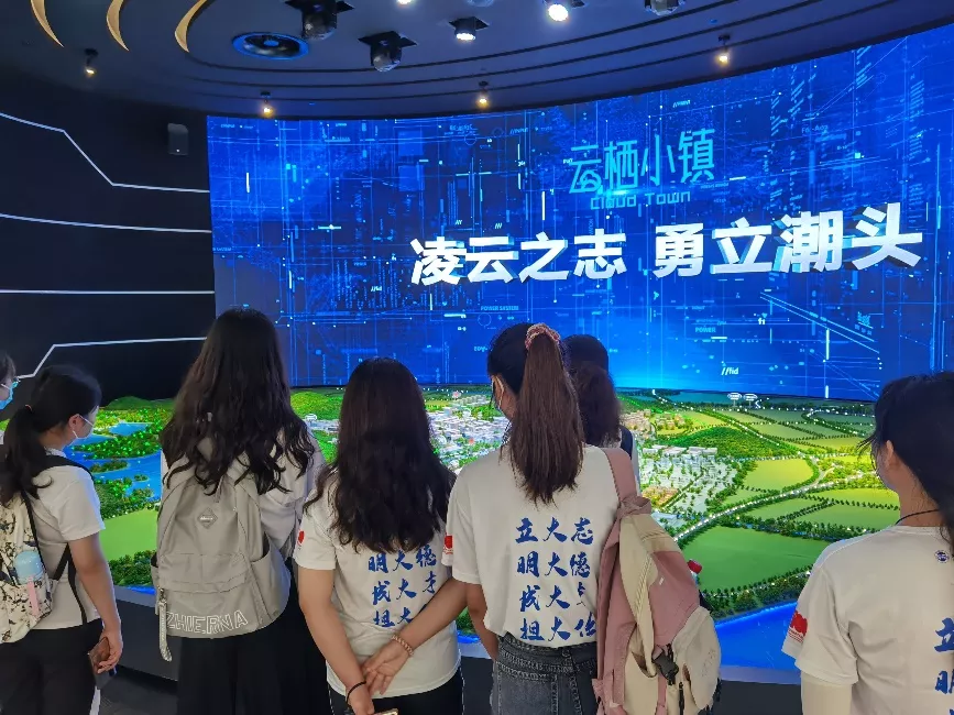 随后,师生一行前往云栖小镇展厅参观。云栖小镇是中国特色小镇改革的先驱和样本,通过建立特色产业、加强人才引进、推进科技创新,实现了深化改革的蓬勃发展,成为世界上数字化水平最高的地区之一。在讲解员的带领下,师生先后了解了云栖小镇的整体布局和区域分布、发展历史及现状、名企名校和五大产业等特色成果。在此过程中,同学们亲身体验了云栖小镇云剧场等特色交互项目,通过多种形式了解云栖小镇的发展成果及互联网科技的发展方向。