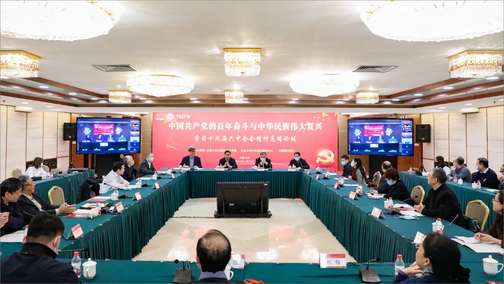 11月21日,由北京大学马克思主义学院、北京大学中共党史研究中心、中国青年报社联合举办的“中国共产党百年奋斗与中华民族伟大复兴——学习十九届六中全会精神高端论坛”在北大英杰交流中心以线上线下结合的方式举行。国内中共党史党建研究领域的有关专家学者就深入学习贯彻落实党的十九届六中全会精神,以史为鉴、开创未来展开热烈讨论。