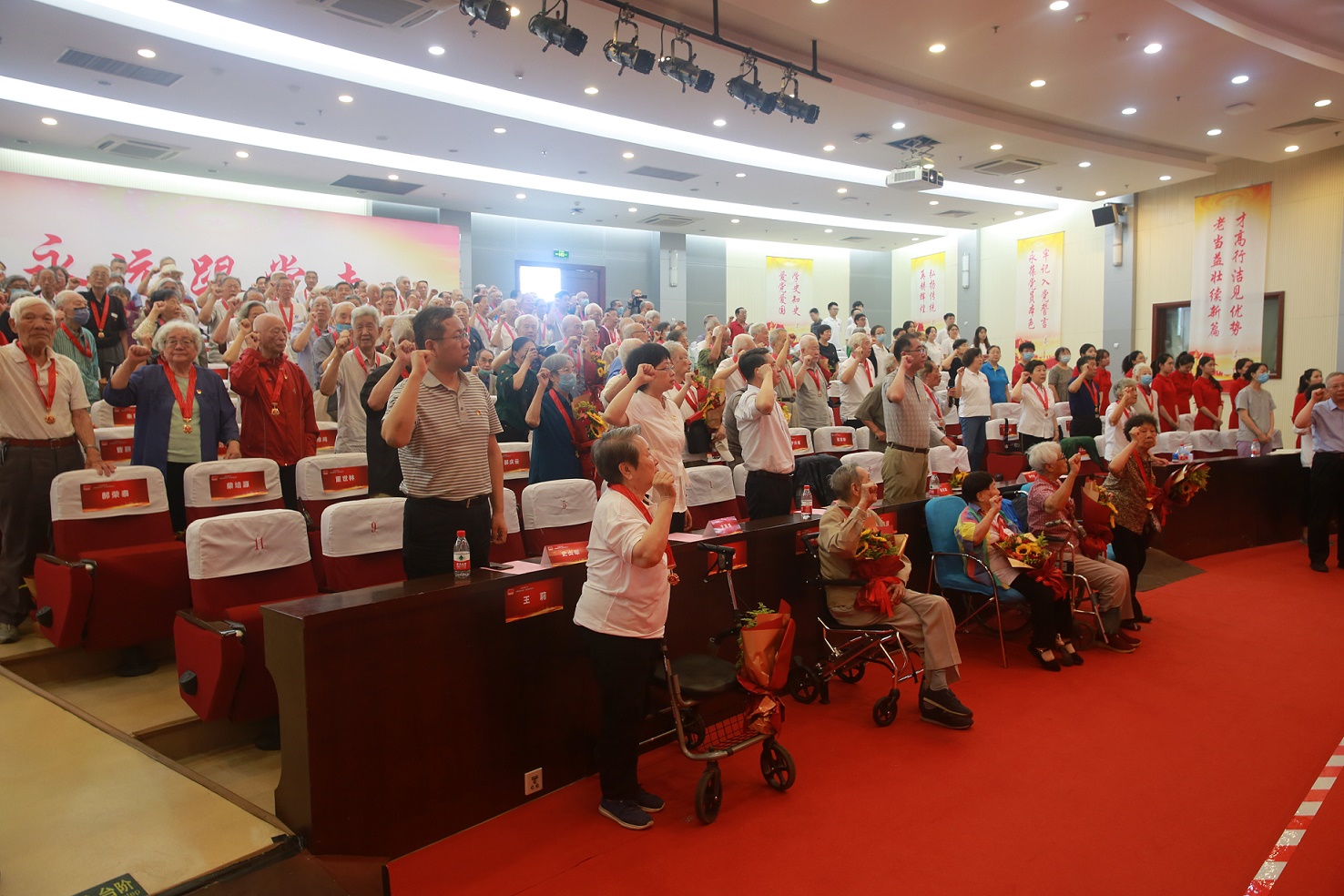 当天到会的年龄最大、党龄最长的党员离休干部孙永春同志作为领誓人带领现场的全体党员重温入党誓词。在庄严的《国际歌》声中,“光荣在党50年”纪念章颁发仪式落下帷幕。