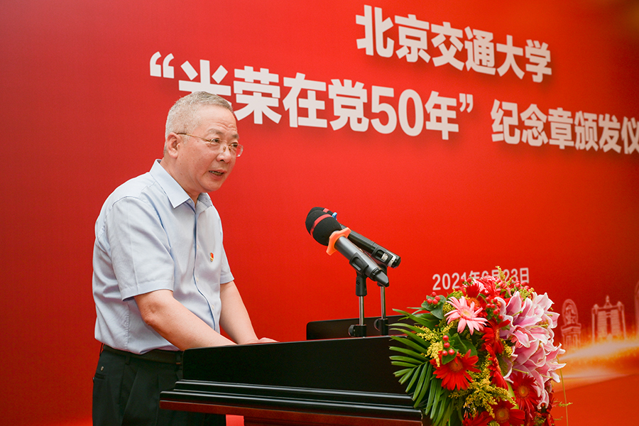 2021年6月23日上午,北京交通大学“光荣在党50年”纪念章颁发仪式在学校机械楼二层学术报告厅举行。“光荣在党50年”老党员代表,校长、党委副书记王稼琼,党委副书记、副校长孙守光、党委副书记文海涛,学校相关职能部处负责同志,部分老党员家属和在校学生代表等230余人出席仪式。