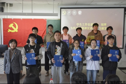 学生工作处副处长刘萍为学院“科学家精神宣讲团”成员颁发聘书,宣讲团致力于弘扬科学家精神,引领青年学子以科学家精神为灯塔,砥砺前行,矢志报国。