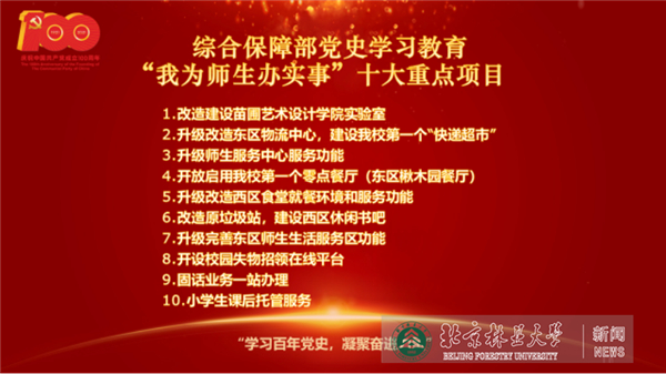 “办实事”篇章,大会公布了综合保障部2021年“我为师生办实事”十大重点项目,并通过视频《“十大实事”献礼百年》展示了项目实施进展和成果。同时,宣布了综合保障部2021年“党员先锋岗”人员名单,并向11位“党员先锋岗”佩戴胸牌、颁发岗位牌,号召各支部和广大党员增强党员身份意识,自觉发挥先锋模范带头作用,用心用情用力为师生办实事、办好事。