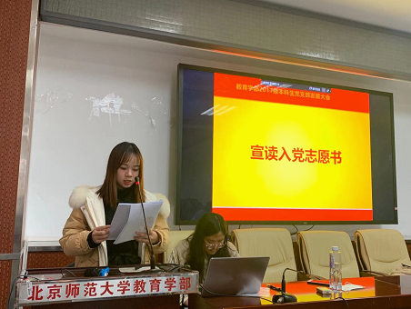 会议在庄严肃穆的国际歌歌声中开始,随后关嘉琦同志介绍本次发展大会的流程和发展对象顺序。大会第一项为发展对象宣读入党志愿书,任航、冉楚琪、王瑞珊、马安瑶四位同志依次宣读了自己的入党志愿书,表明了自己向党组织靠拢的决心、对党的认识和对自我的反思。