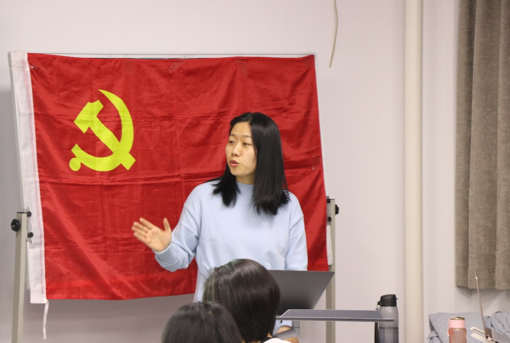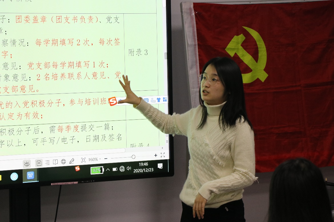 会议议程第三项,党建组织员兼2018级硕士研究生第八党支部书记叶品、党建组织员兼2019级硕士研究生第五党支部书记刘坤为在场党支部书记进行学生党员发展流程与材料规范培训。