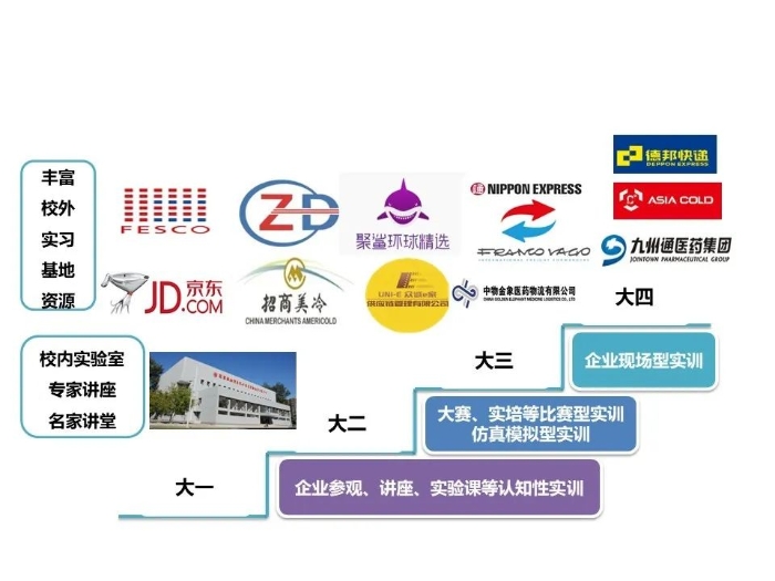 构建递阶式实训培养体系,强化实战能力。物流管理专业高度重视学生的创新实践能力培养,经过不断探索,构建了以“学科竞赛+创新实践+企业家创业指导”为一体的实战型物流人才培养机制,将创新、创业融入人才培养体系,实现学生“实操、优化、创新”为核心的递进式能力培养。