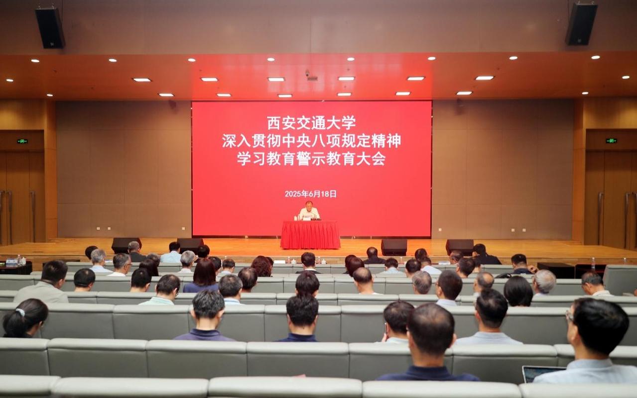 6月18日,西安交通大学召开深入贯彻中央八项规定精神学习教育警示教育大会。会议全面落实中央关于八项规定精神学习教育的部署要求,围绕以案说德、以案说纪、以案说法、以案说责提出要求,教育引导全校党员、干部进一步增强廉洁自律意识和拒腐防变能力,持续营造风清气正、干事创业的良好政治生态。西安交大党委书记卢建军传达了习近平总书记关于加强党的作风建设的重要论述,并对全校加强作风建设、扎实推进学习教育作出部署。校长张立群等领导班子成员,各院系、职能部门主要负责人和重点领域干部、离退休干部、非党员干部代表参加会议。会议由卢建军主持。