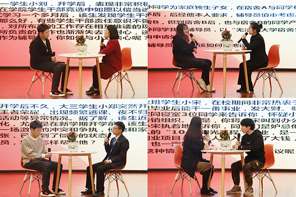 在案例分析和谈心谈话环节,选手围绕爱国教育、学风建设、心理疏导、奖助评定等问题展开情景模拟,将教育、管理、服务有机结合,用心帮助学生分析面临的问题,探讨解决问题的思路,充分展示了我校辅导员思想理论、语言表达、逻辑思维和应急管理等多方面的素质和能力。