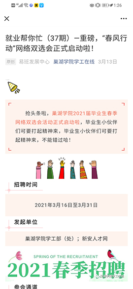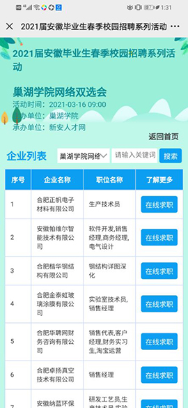 为贯彻落实党中央国务院“六稳”“六保”决策部署,务实推进毕业生就业工作,助力2021届毕业生更高质量和更充分就业,巢湖学院联合新安人才网于3月16日至31日成功举办“春风行动”2021届毕业生网络双选会。