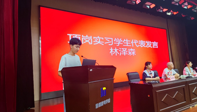 数控1934班林泽森作为2019级学生代表发言,他感谢学院各位老师、领导的悉心培育,实习中要做到严守纪律,注重专业技能提升,心怀大义,勇于担当。