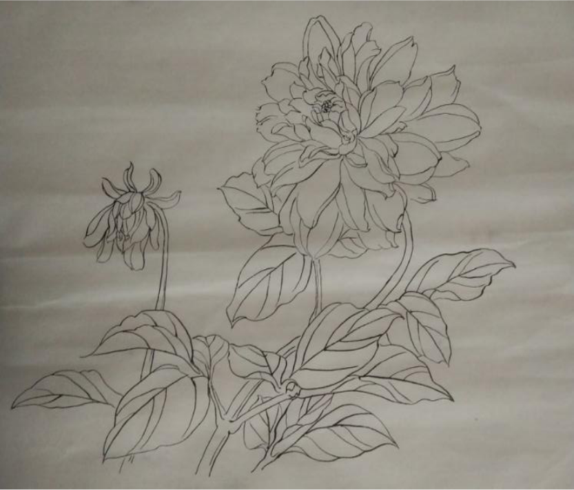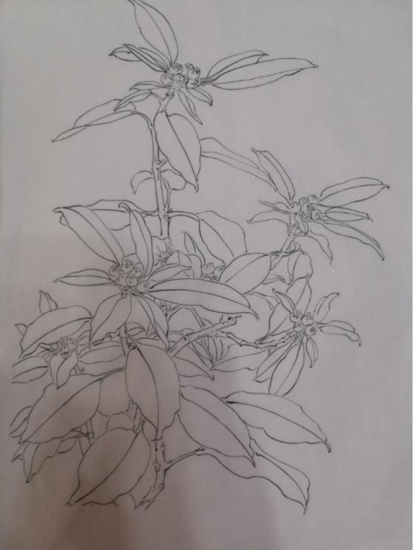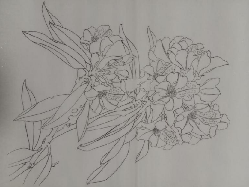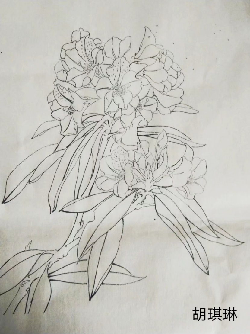 学习了白描课,我知道了白描讲究笔墨,线的勾勒根据对象的不同,要有线条和墨色的变化。勾花要用细的线,浅色花瓣线的墨色要淡,有时还用颤笔表现花的褶皱,勾叶的线要粗于花,线条要有力紧绷。感谢老师这个月的悉心教导。
