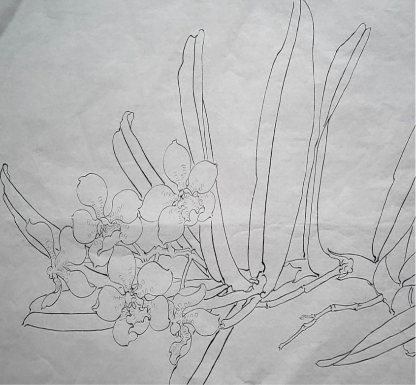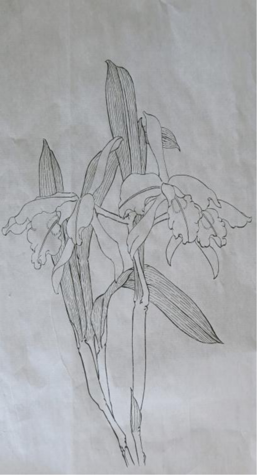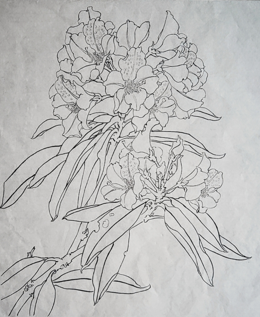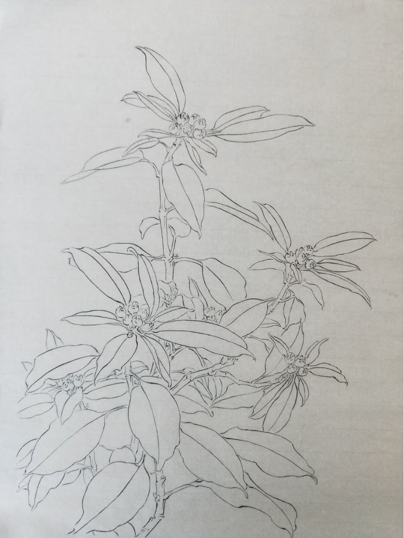 学习了白描课,我知道了白描讲究笔墨,线的勾勒根据对象的不同,要有线条和墨色的变化。勾花要用细的线,浅色花瓣线的墨色要淡,有时还用颤笔表现花的褶皱,勾叶的线要粗于花,线条要有力紧绷。感谢老师这个月的悉心教导。
