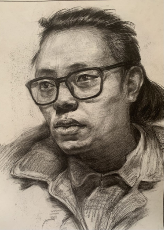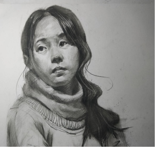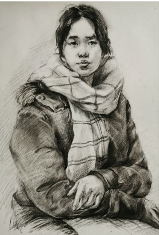 课程中我们学习了半身像的画法,以及精微素描,我的作品中利用了一张自己的生活照并加了一条围巾。这节课结束以后我的收获还是很多的,以后会多去改进。