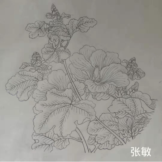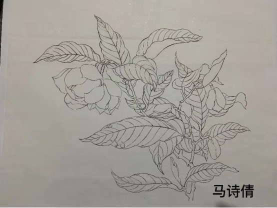 陈婷婷:经过四周的练习我对白描有了更深的体会,每一幅画都需要以认真的态度去对待。横平竖直再画圆,顺笔逆笔力道均匀。白描讲究笔墨,线的勾勒根据对象的不同要有线条和墨色的变化,勾花要用细线,浅色花瓣墨色要淡,在此次课程中学习到很多知识,感谢老师对我们的教导。