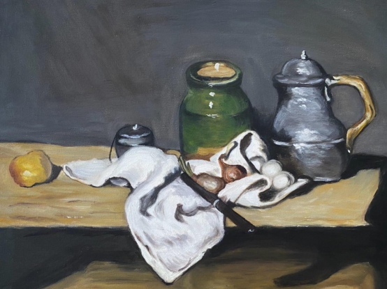 通过对油画静物的学习,本班学生在平时表现出了积极的学习态度和专业学习热情,绘画的积极性比往届有提高,对思政要素的理解比较深入,最后的长期作业也反映出学生的动手及创新能力很强,但由于受疫情、军训的影响部分同学画得不够深入,但大部分同学都能通过此次训练,丰富自己的绘画语言与提高表现能力。教师培养与启发学生寻找自己的绘画语言及创作主题尤显重要,激发他们对绘画形式探索的兴趣。