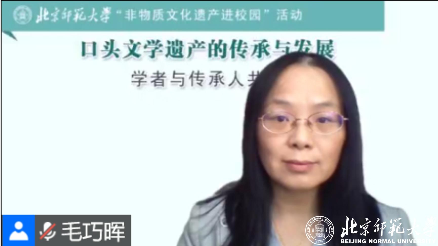 10月25日,北京师范大学“非物质文化遗产进校园”活动之“口头文学遗产的传承与发展:学者与传承人共谈”线上活动举行。本次活动由北京师范大学党委宣传部、北京师范大学文学院、北京民间文艺家协会和北京师范大学非物质文化遗产研究与发展中心联合主办。