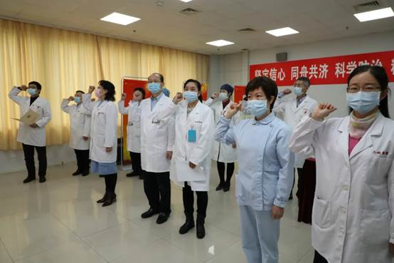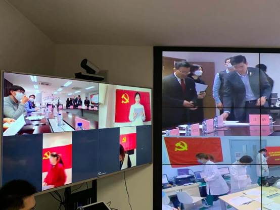 两位同志和在场的全体医院党政领导共同宣誓,由儿科医院党委书记徐虹同志领誓。因情况特殊,来自前线临时党支部的5名党员在传染病隔离病房内,采取视频连线方式见证了此次庄严、神圣的时刻。