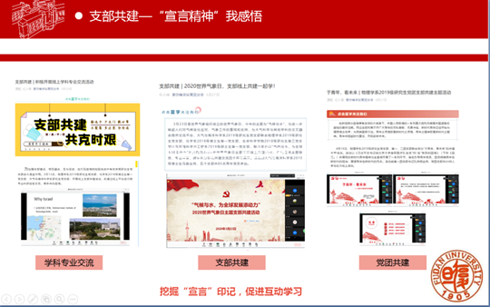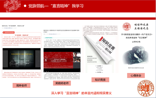 在“宣言精神我学习”版块,支部组织党员学习陈望道老校长的事迹,聆听了两场主题报告、举办线上知识竞赛,撰写了2万多字的学习心得。开展“宣言精神我体会”活动,支部邀请系党委副书记周序倩同志作党课,学习和感悟复旦物理学系传承宣言精神的故事;邀请王泽、金义波两位赴基层就业的选调生,分享科研报国的心路历程及复旦物理人在基层岗位发挥作用的事迹,从“历史”和“现在”两个维度上体会复旦“物理人”对“宣言精神”的践行。开展“宣言精神我感悟”活动,支部通过与高年级党支部共建,挖掘更多“宣言精神”的内涵。倡议“宣言精神我传承”,支部以口述史项目为载体,整理出3万余字的院士故事集,在班级微信公众号推出《迎校庆,共“宣言”,学习“宣言精神”心得体会》系列文章。疫情期间,支部还开展“科研分享,明理防疫”系列主题党日活动11期,从理论到实践,为同学们科研交流、学术分享与生涯引导提供服务,实现“宣言精神我带动”。