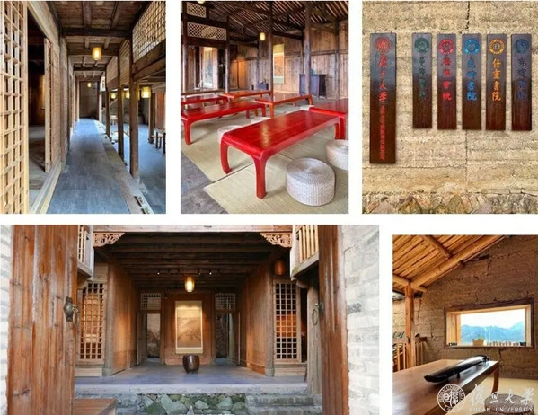 2018年7月,复旦大学书院教育实践基地在复旦大学与屏南县政府正式签约后投入使用。这是在原民居的基础上改造而成的教学研讨空间,室内配备投影仪、话筒、无线网络等复旦常规教室拥有的硬件设施。不同寻常的是,这栋可容纳100人左右的“教室楼”设计顺应当地自然环境,借鉴宋代建筑风格,石板铺地,竹木为墙,梁柱保留木材的原生质感,整齐架设。墙面上,暖色调的灯光打在书法和花鸟画上,富有文化气息。师生可以在特制的蒲团上一边喝茶,一边交流。