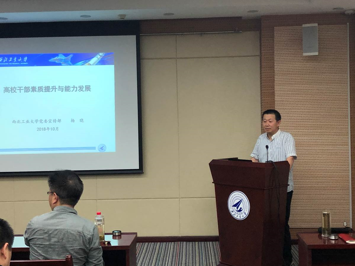 6月12日下午,“翱翔处级干部培训班”邀请学校党委常委、党委宣传部部长杨晓作题为《高校干部素质提升与能力发展》的专题讲座,讲座由机关党委书记李小聪主持。