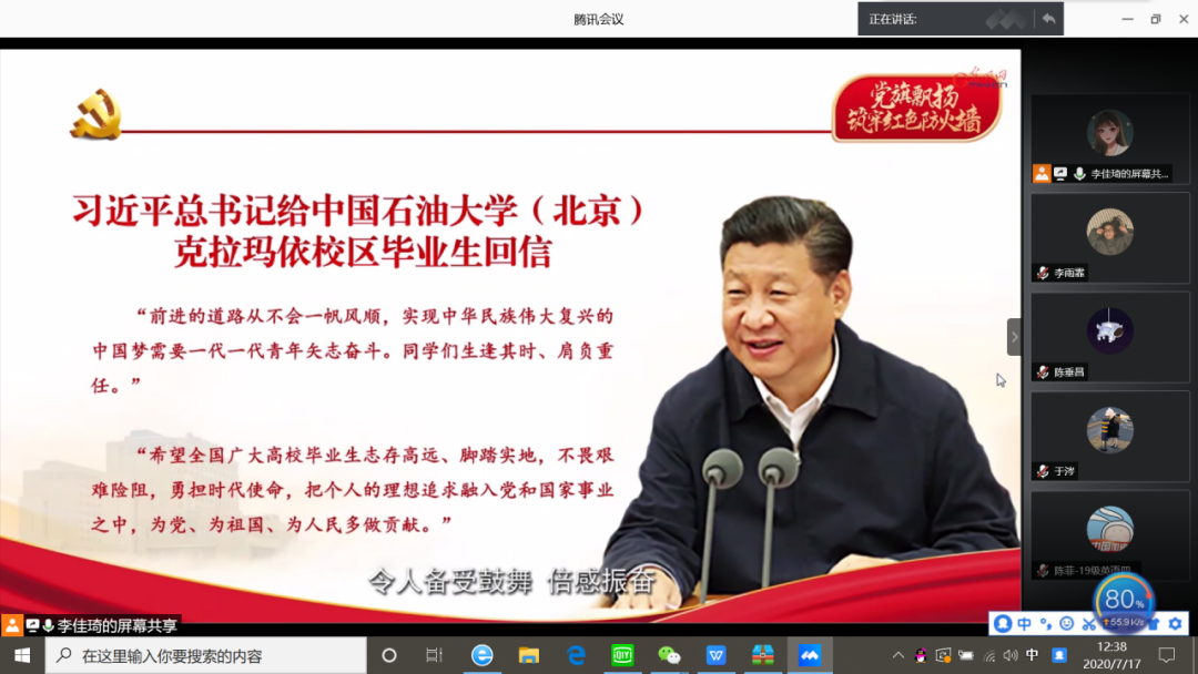 7月17日,外国语学院本科生第一党支部书记刘东宇组织积极分子们共同观看学习高校党组织战“疫”示范微党课第五讲。一个个生动鲜活的镜头,一次次谆谆嘱托,让同学们感受到了疫情之下,全国人民不断在磨难中成长。