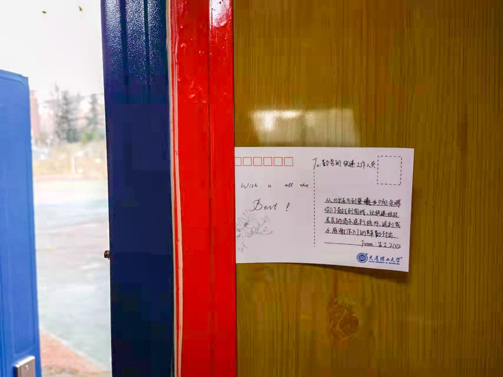 “给勤劳的快递工作人员:从日出东方到夕阳余晖,你们奋战到前线,让快递经过层层消杀送到校内,送到我们手上,感谢你们的辛勤付出!”在这个因为疫情显得更加寒冷的冬日,一封来自生工2102班的感谢信温暖了学校快递收发工作人员的心。