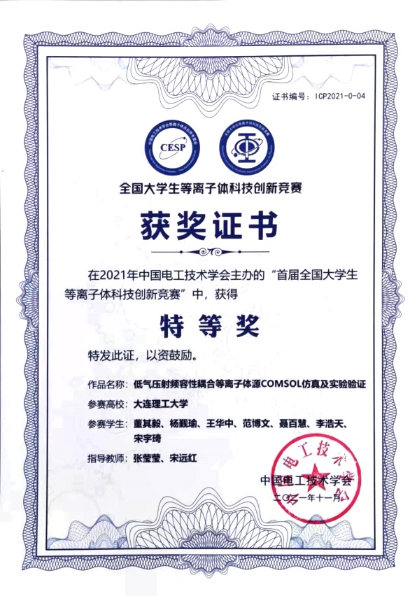 最终,我校参加初赛和决赛的11支队伍均取得了优异的成绩。在本届竞赛本科生和研究生同场竞技的情况下,我校本科生作品《低气压射频容性耦合等离子体源COMSOL仿真及实验验证》(物理学院,指导教师:张莹莹、宋远红)荣获特等奖,是15支获得特等奖队伍中为数不多的本科生队伍。作品《自中和微型射频离子推力器SRIT-4数值设计》(航空航天学院,指导教师:夏广庆、孙斌)、《新型等离子体手机消毒装置》(生物工程学院,指导教师:杨君)获一等奖;作品《等离子体果蔬去农残洗消一体机》(物理学院,指导教师:杨德正)、《介质阻挡放电等离子体改性电缆交联聚乙烯》(电气工程学院,指导教师:姜楠)、《一种低臭氧低温等离子体源的设计与开发》(物理学院,指导教师:杨德正)获二等奖;作品《等离子体-发射光谱法检测水产品中重金属一体机开发》(物理学院,指导教师:杨德正)、《双电极直流电弧炉熔炼氧化镁的数值模拟研究》(电气工程学院,指导教师:王振)、《氩气感性耦合等离子体中心体区和边缘鞘层内的输运过程解析》(物理学院,指导教师:赵书霞)、《基于空间探测等离子体元素检测技术研究》(物理学院,指导教师:杨德正)、《等离子扬声器》(电气工程学院,指导教师:张颖杰)获三等奖。