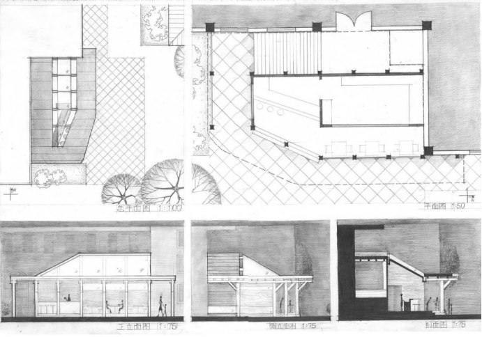 作图对尺寸的精确要求与模型的直观操作相辅相成,练习四和练习五是平行进行的。关于建造的图面表达主要体现在1:50的剖面和立面图。立面图需要表达材质和光影。