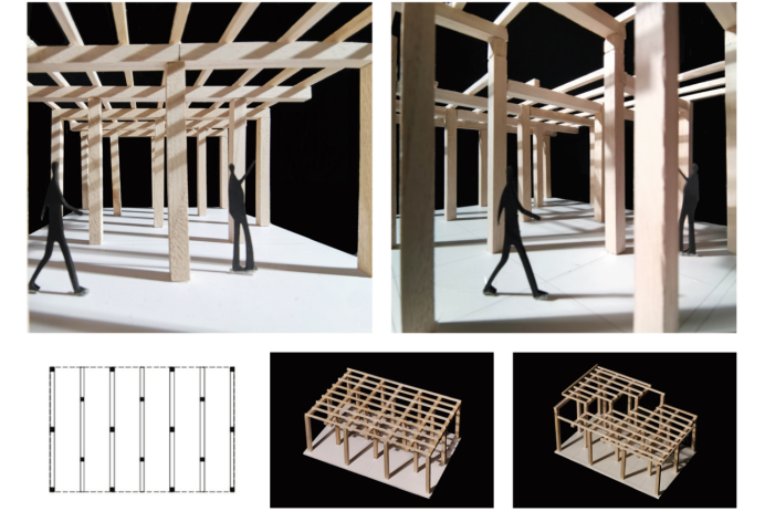 课题练习从一个给定的结构类型出发,通过区分此结构中的主架构和次级结构,初步理解其中的“体系”概念;进而通过把握架构在高度和平面上的变形逻辑,进一步理解此“体系“,以及结构与空间、使用和场地的关系;接下来在基于给定节点规则的大比例架构搭建中,材料、构件、交接和构造等问题开始出现,而在对这些问题的处理中,建构表达的概念逐渐形成。