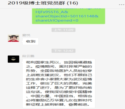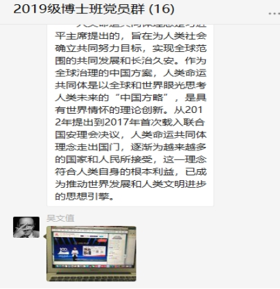 2019年9月18日,国际经济贸易学院2019级博士党支部副书记牟卫卫组织了高校党组织战“疫”示范微党课“致敬最美白衣天使,弘扬伟大抗疫精神 ”专题学习,本次活动中本党支部成员通过光明网、新华网、微言教育、央视频、中国大学生在线、B站、快手等网站观看学习了高校党组织战“疫”示范微党课“致敬最美白衣天使,弘扬伟大抗疫精神 ”专题,并积极发表学习感言。
