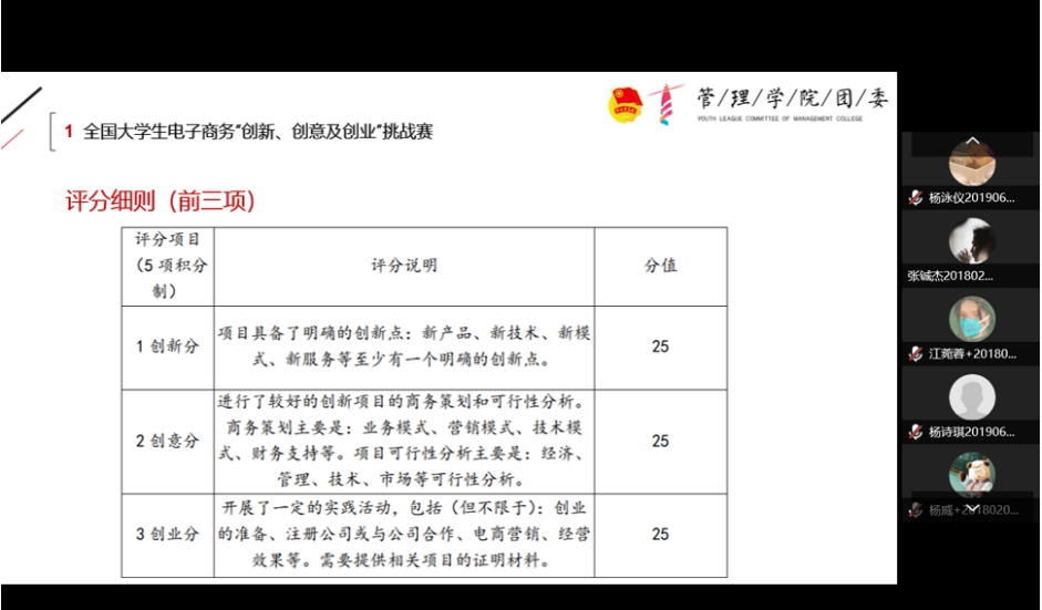 陶慧仪同学以“解读‘互联网+’大学生创新创业大赛”为主题,通过线上讲解和互动提问等形式对“互联网+”大赛的影响力、重要性、赛事特色以及比赛流程进行了解读,重点强调了明确参赛初心的重要性,并在挖掘项目、组建团队及选择赛道组别等方面给出了许多可行性建议。同学们收获颇丰,反响热烈。本次活动加深了管院学生对“互联网+”创新创业大赛的了解,极大地激发了同学们的创新精神、增强创新意识和提升创新创业能力。