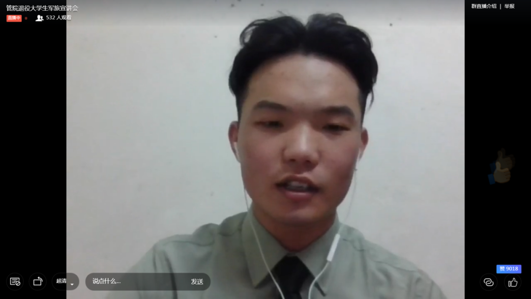 宣讲会历时139分钟,此次宣讲会直播观看人数达585人,通过线上直播宣讲、互动等方式,进一步加深了学生对入伍流程、优惠政策、军营生活等方面的了解,进一步明确了大学生应征入伍的重要意义,激发了学生们参军入伍的热情。