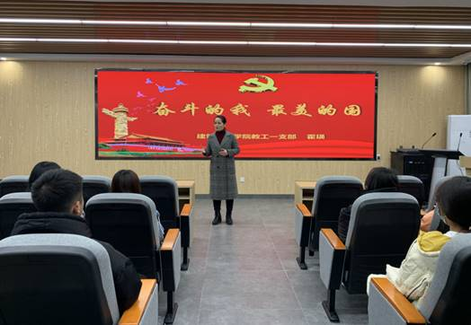 报告会收看结束后,教工一支部书记霍瑛为与会同志开展了“奋斗的我,最美的国”主题教育,她讲到疫情防控是一场特别感人的、生动的思政大课,通过刚才聆听抗疫巾帼英雄的感人故事,无论是在为党育人、为国育才的人才培养中,还是在建设社会主义现代化强国的征程上,都将有巨大的推动和激励作用,激励同学们努力奋斗、见贤思齐,作出无愧于时代的贡献。希望同学们在榜样的示范、激励和引领下,把个人理想追求融入党和国家事业之中,担当德智体美劳全面发展的社会主义建设者和接班人,以“奋斗的我”报效“最美的国”,为实现中华民族伟大复兴的中国梦贡献青春力量。