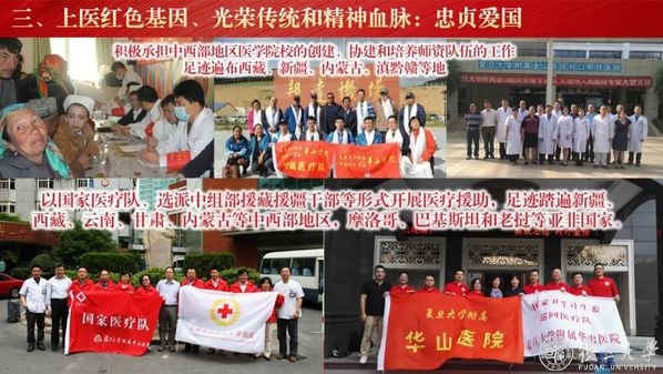 “五十年代的西迁建设重医是最集中的体现。”袁正宏结合院史原创话剧《我们的西迁》视频片段,重点讲述了上医西迁的故事,400余名上医前辈,响应党的号召,毅然溯江而上,远植巴山渝水,开启了上医二度西迁、开拓兴学的历史。“上医人始终将国家和民族置于最高的位置,这就是爱党爱国的深刻体现。”除了援建重庆医学院,几十年来,上医不断加大援外支边、服务中西部的力度,在祖国各地、世界各地践行爱国奉献的理念。