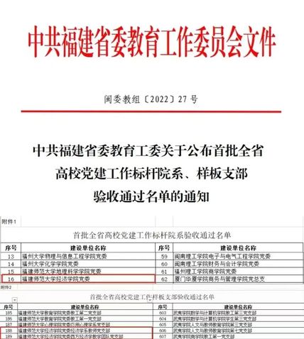 近日,福建省委教育工委发布了《中共福建省委教育工委关于公布首批全省高校党建工作标杆院系、样板支部验收通过名单的通知》,经建设单位对标自查总结、建设单位所属学校党委把关审核、省委教育工委组织专家评审和会议研究,认定福建师范大学经济学院党委通过“全省党建工作标杆院系”建设单位验收,经济学系教师党支部、西方经济学教学团队党支部等2个党支部通过“全省党建工作样板支部”建设单位验收。