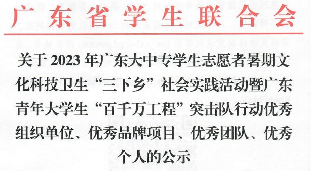 本站讯 近日,广东省学生联合会秘书处对2023年广东大中专学生志愿者暑期文化科技卫生“三下乡”社会实践活动暨广东青年大学生“百千万工程”突击队行动优秀组织单位、优秀品牌项目、优秀团队、优秀个人进行公示,“广东科学技术职业学院助力珠海白蕉海鲈预制菜产业数字化升级实践团”获评为省级优秀团队。