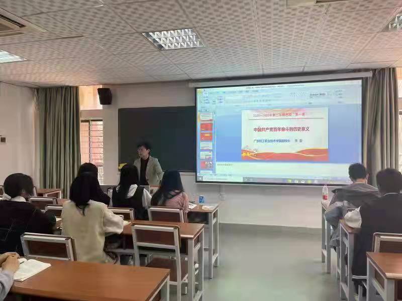 3月9日上午,广东轻工职业技术学院副校长、轻化工技术学院院长李荣于南海南校区4号楼203教室为食检213、化妆品213班的同学讲授了以“中国共产党百年奋斗的历史意义”为主题的“思政第一课”,并与同学们亲切互动。