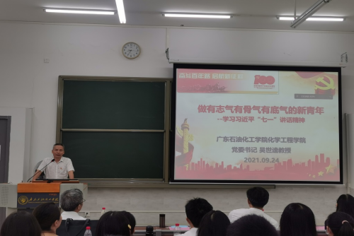 吴世逵书记结合学习习近平“七一”讲话精神,作题为《做有志气有骨气有底气的新青年》思政课讲授,课堂上,吴书记和同学们一起回顾了党的百年大庆盛况,引用了习近平寄语新青年的话语,引导同学们要做有志气有骨气有底气的新青年,同时结合广油特质,勉励全体化工人弘扬“听党召唤、为国奉献、艰苦创业、忠诚担当”广油西迁精神。