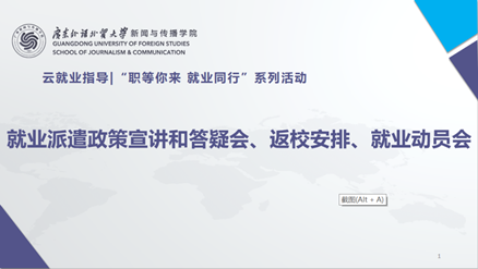 第一部分由辅导员陈博菲作就业派遣政策宣讲和答疑,首先讲解了 “广东大学生就业创业”小程序的就业服务模块功能,包括电子就业协议、就业派遣、就业创业信息填写等重要模块的使用说明,解释了三方协议、生源地确认、接收函、报到证、调整改派、党组织关系转接等诸多就业派遣相关事项。并指出:广东省从2019年5月开始,所有的就业手续可以通过智慧服务平台实现“线上一站式” 办理,特别是疫情期间,为学生提供了很大的便利。