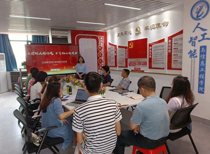 6月9日下午,人工智能与信息工程学院教工党支部书记梁毅娟在信息交通楼920会议室以“立德树人铸师魂,不忘初心担使命”为题,向全体支部党员上了一堂生动党课。