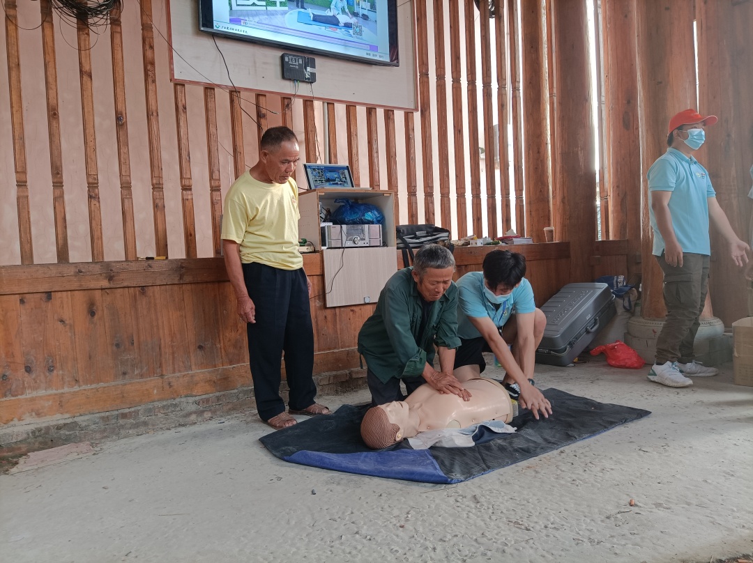 8月16日,实践团在桂书村开展消防安全知识宣传活动,旨在加强村民消防安全意识,提高村民消防急救技能。消防安全知识宣传活动分为五个部分,火灾逃生演练、消防安全知识宣讲、消防安全知识竞答、电器火灾扑灭演练和心肺复苏急救方法。其中火灾逃生演练是针对于中小学生在应对教学楼等火灾的逃生方法,主要对中小学生进行宣传;心肺复苏则是对所以村民进行宣传,火灾中,死于窒息的人数占绝大部分,窒息是因为喉咙或气管因刺激性气体长时间停留而造成骤然梗塞,造成呼吸困难。此时如果抢救不及时则很有可能发生生命危险。在鼓楼里,实践团向村民们演示在火灾中有人因为吸入大量烟气而昏迷该如何救援,并在现场利用橡胶假人模拟心肺复苏教学,组织村民们一起做心肺复苏实验。实践团以活动的形式传播消防安全知识,以实际操作演示普及自救方法。