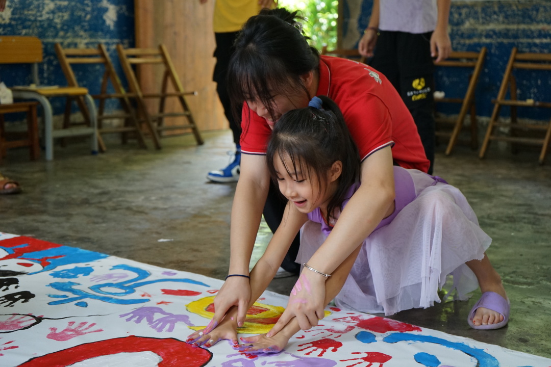 小朋友开心地与实践团成员在画布上留下手的印记