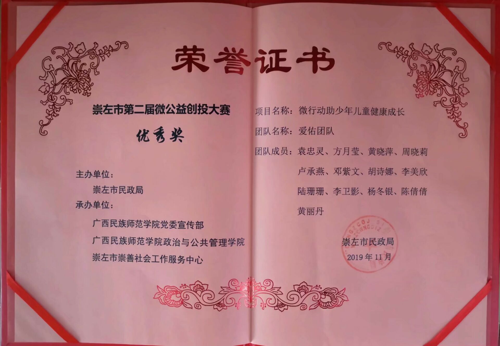 热烈庆祝政管学院爱佑团队荣获崇左市第二届微公益创投大赛“优秀奖”。