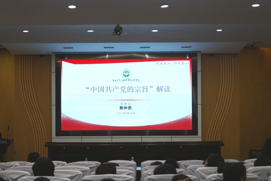 黄仲贵书记以《“中国共产党的宗旨”解读》为题讲授专题党课,深入浅出地为同学们讲解了中国共产党的宗旨。中国共产党的宗旨是“全心全意为人民服务”,黄仲贵书记以丰富的史实阐述了“全心全意为人民服务”的思想的渊源,以精辟的语言讲述党的宗旨的发展历程,通俗易懂地讲解了党的宗旨所涵盖的思想内容。黄仲贵书记强调要正确认识党的宗旨,深刻认识党的宗旨含义及其地位。