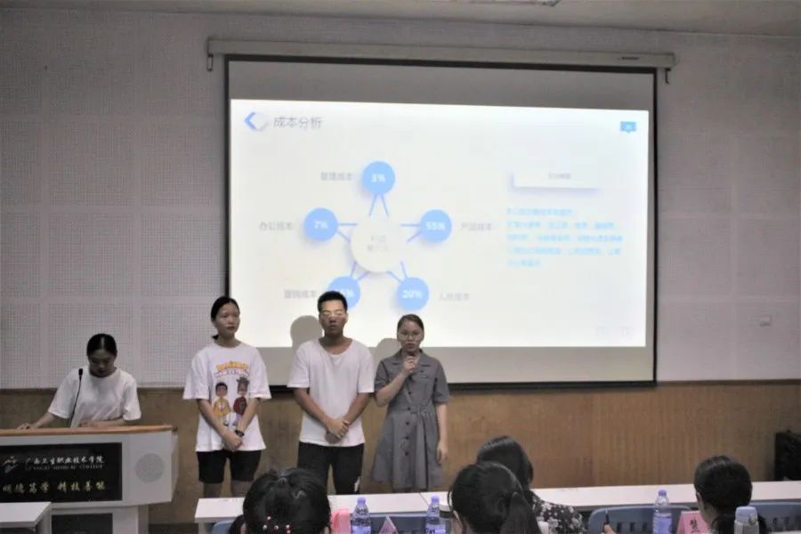 接着,本次比赛设有7分钟“项目展示”和3分钟“现场答辩”,两个环节。参赛选手分别以PPT的形式来展示自己团队的创新创业项目。在比赛过程中,同学们以饱满的精神状态,拿出他们自己的劳动结晶,充分展现了他们的创新精神和团队精神。在面对评委老师犀利的提问的同时,也考验了各组创业计划的周密程度及团队的现场应变能力。