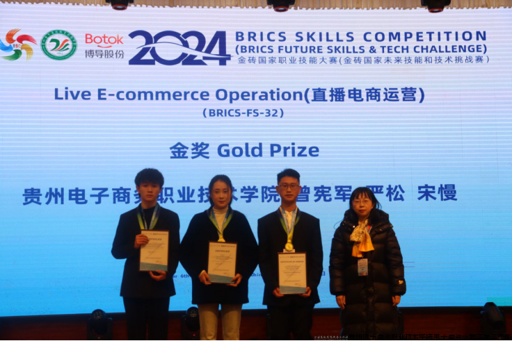 依托职业技能比赛,培育专业化数字电商人才。坚持以赛促教、以赛促学、以赛促改、以赛促建,将以参加和承办职业技能比赛为契机,持续推进教学改革,及时总结竞赛经验,建立竞赛长效机制,优化技能培训方案,培养更多具有“工匠精神”的高素质新电商数字技能型人才。2024年指导学生参加摩洛哥“数字北非”技能大赛国际总决赛跨境电商赛项中荣获第二名,斩获银牌;参与承办2024年贵州省职业院校师生技能大赛直播电商赛项、2024年金砖国家职业技能大赛直播电商运营赛项中国分赛区国际总决赛等。2024年获得国家、省、市技能比赛173个奖项。
