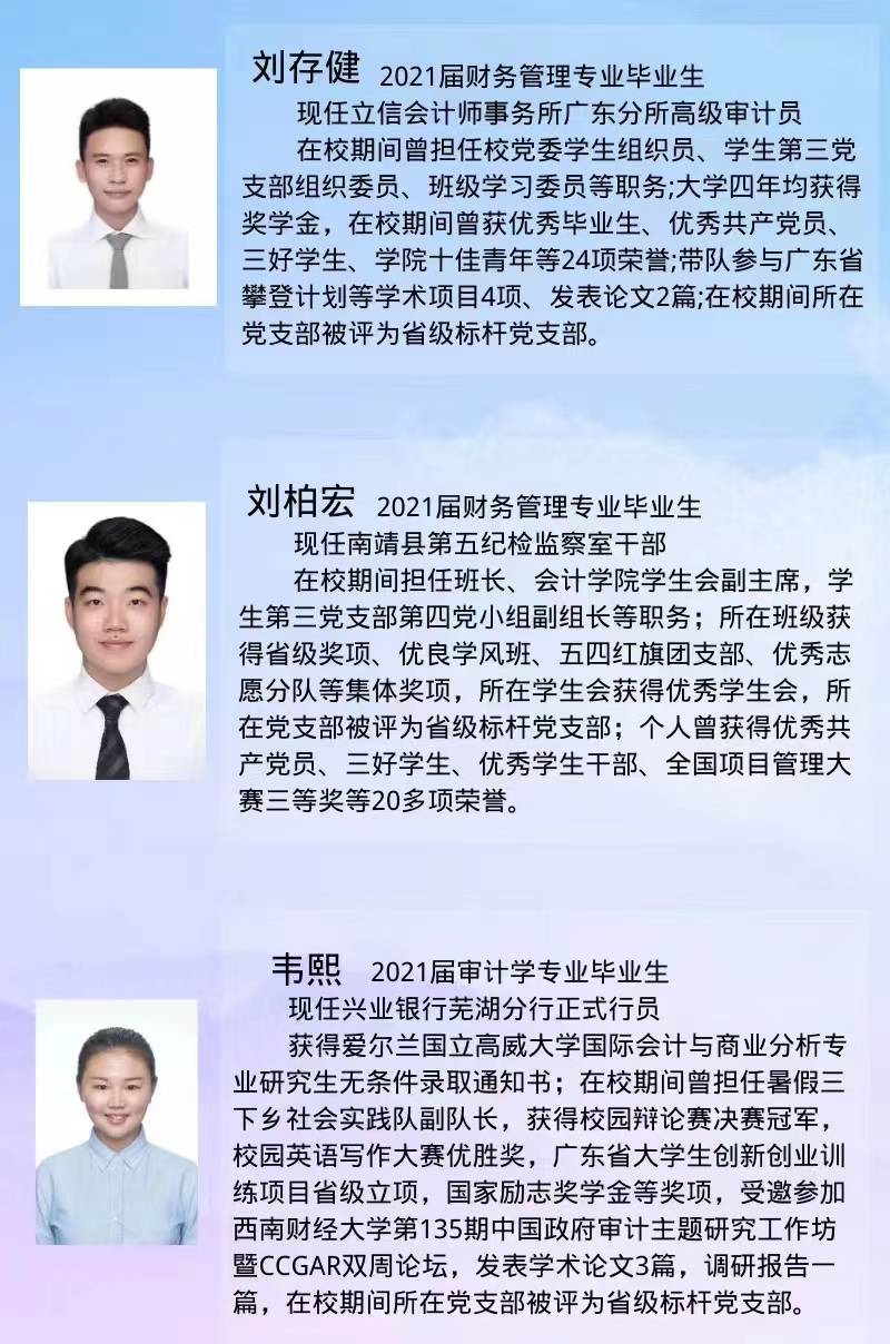 本次就业经验分享会采取线上腾讯会议视频连线,线下组织支部成员集中观看腾讯会议视频的形式。主讲嘉宾为会计学院学生第三党支部优秀毕业生党员,分别是刘存健、刘柏宏和韦熙。