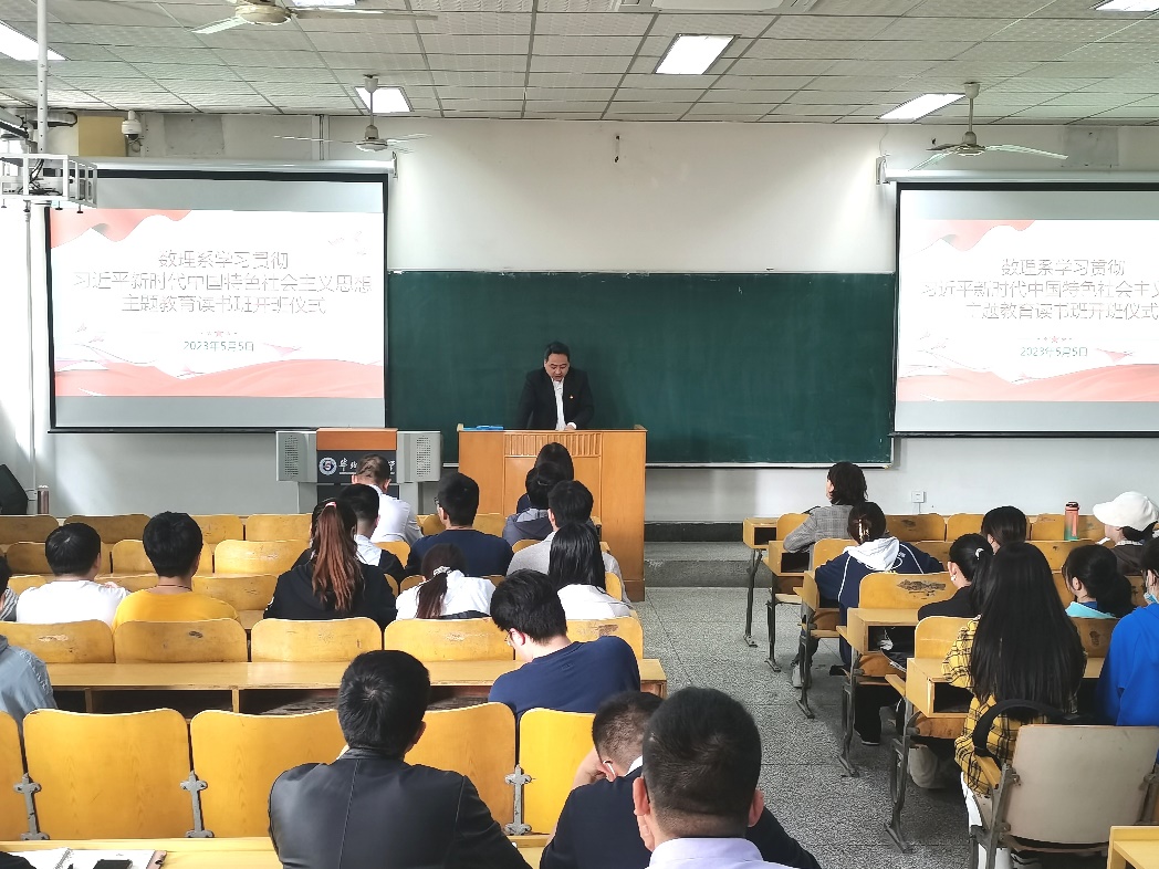 在开班仪式上,江卫春表示,举办主题教育读书班是学习贯彻习近平新时代中国特色社会主义思想主题教育、深化理论学习的必要举措,是推动“关键少数”以上率下、带头学习贯彻习近平新时代中国特色社会主义思想的重要途径,因此,数理系党员同志们要高度重视读书活动,牢牢把握“学思想、强党性、重实践、建新功”的总要求,带着嘱托学、带着感情学、带着责任学,推动党的创新理论真正入脑、入心、入行。江卫春对数理系师生党员提出三点学习要求:一是突出学习重点,做到一篇一篇学、逐段逐句悟,切实深刻学习领会习近平新时代中国特色社会主义思想的科学体系、核心要义、实践要求;二是准确把握学习形式,要把查找解决突出问题作为集中学习研讨的重要内容,紧密结合工作实际,坚持学思用贯通、知信行统一;三是注重学习效果,聚焦学习内容,围绕校系工作要点和重点任务精准发力,切实把习近平新时代中国特色社会主义思想转化为坚定理想、锤炼党性和指导实践、推动工作的强大动力。